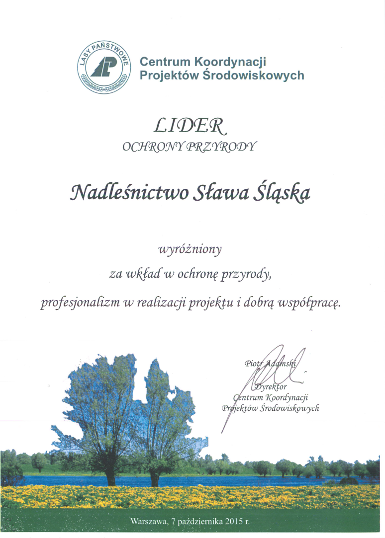 Lider Ochrony Przyrody – takim tytułem uhonorowane zostało Nadleśnictwo Sława Śląska w dniu 7 października 2015 r. podczas konferencji podsumowującej działania podejmowane w ramach V osi priorytetowej Programu Operacyjnego Infrastruktura i Środowisko. Dyplom wręczony został Nadleśniczemu Nadleśnictwa Sława Śląska - Panu Wiesławowi Daszkiewiczowi przez Pana Piotra Adamskiego - Dyrektora Centrum Projektów Środowiskowych.